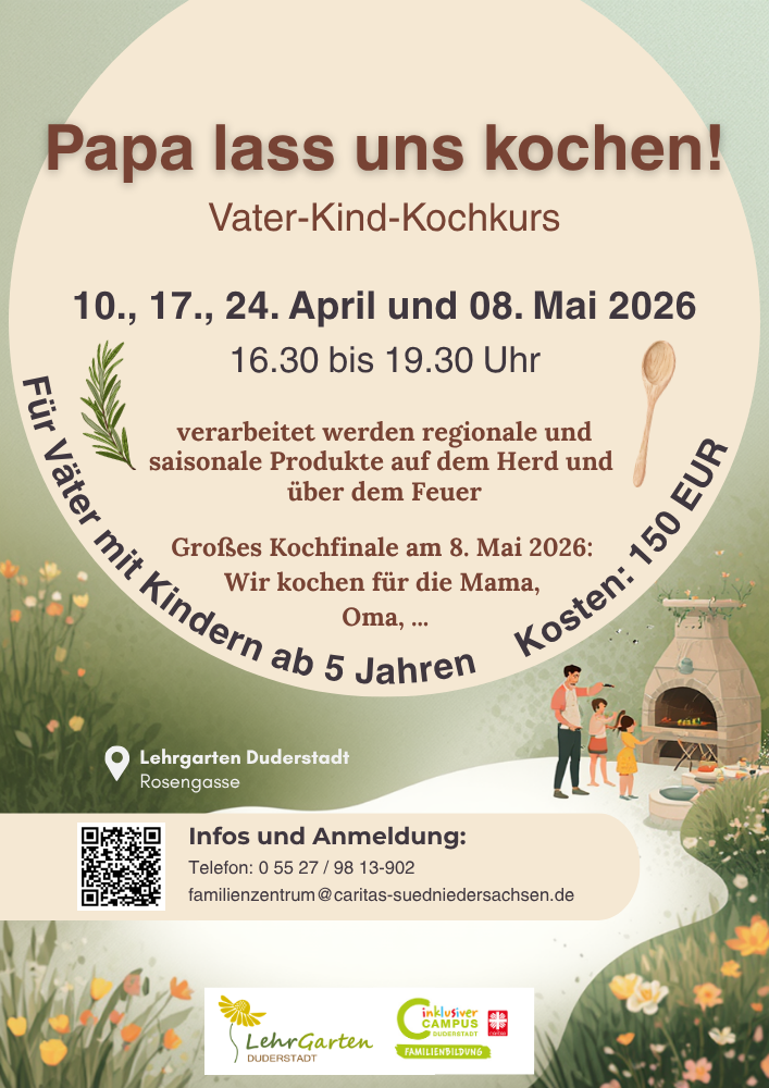 Wir kochen auf Feuer und in einer herkömmlichen Küche, wir kochen praktisch, regional und saisonal. Zum Abschluss am 8. Mai kochen wir Gäste aus unseren Familien. Eine festliche Tafel wird gedeckt ein ein Drei-Gänge-Menü zubereitet mit Suppe, Hauptgericht und Nachtisch.